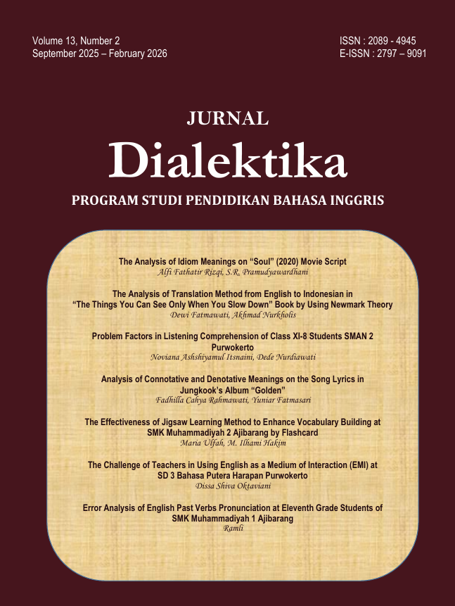 Listening is one of the essential skills in English language learning, yet it remains one of the most challenging for students. This research aimed to investigate the main factors that contribute to students’ problem in listening comprehension and to explore the strategies used by the teacher to overcome them. The study was conducted at SMAN 2 Purwokerto with a qualitative descriptive method. The data were collected through classroom observation, interviews with 33 XI-8 grade students and one English teacher, as well as documentation of students’ listening scores. The findings reveal that both literal and inferential level students experience similar problem, primarily caused by three factors: the listening material (such as fast speech, unfamiliar accents, and long audio texts), the listener (limited vocabulary and concentration issues), and the physical setting (classroom noise and technical problems). The most dominant difficulty came from the listening material, especially the speed of speech and recognize main point. Moreover, the teacher employed several strategies to help students improve their comprehension, including audio replay, pre-teaching vocabulary, and group discussions. Among these, audio replay was considered the most effective by students. This study suggests that both the complexity of the listening materials and students' readiness should be considered when designing listening activities.
