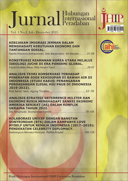 Vol. 1 No. 1 (2022)Jurnal Hubungan Internasional Peradaban merupakan wadah kepenulisan ilmiah civitas akademis di Universitas Peradaban maupun semua universitas lain secara umum. Penulisan akademis yang diterima bisa berupa artikel ilmiah hasil penelitian lapangan maupun penelitian pemikiran terkait kajian hubungan internasional, elaborasi pemikiran, dan resensi buku. Kajian dengan Tema tradisional dan non tradisional dalam hubungan internasional secara umum menjadi wilayah kepenulisan yang diutamakan terlebih jika memfokuskan kepada isu-isu negara berkembang.